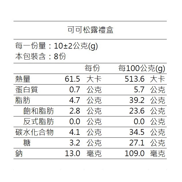 ▲成分:可可膏、可可脂、大豆卵磷脂、天然香草香料、鮮奶油、奶油、糖、可可粉。