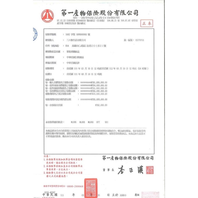 食 在 安 心:本產品己投保第一產物1000萬產品責任險