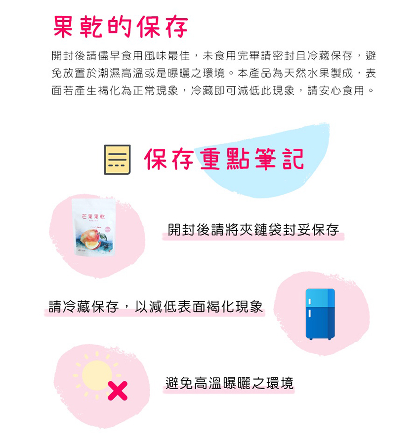 ※果乾開封後請儘早食用風味最佳,未食用完畢請密封且冷藏保存