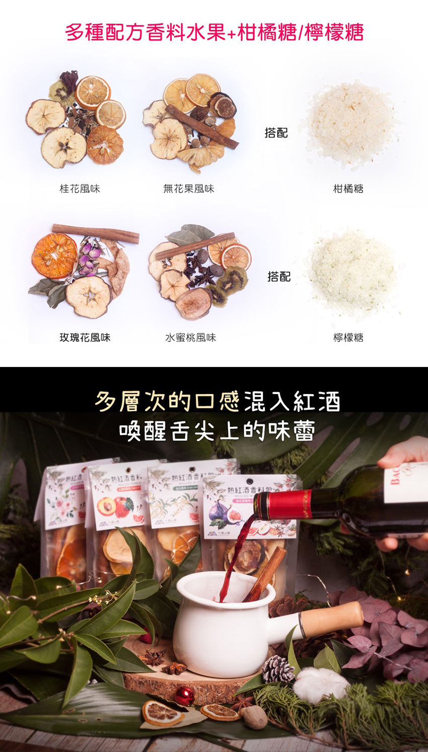 熱紅酒的主要魅力元素為:香料、水果、紅酒。小旭山脈的熱紅酒香料包,含有最豐富多種的水果乾,加上不同配方的特調香料,絕對料多滿足,手作的柑橘糖跟檸檬糖,將柑橘類水果的皮削成屑,混入冰糖成為獨家風味,1包香料包適用於一瓶750ml的紅酒,方便又美味,聖誕節交換禮物拿出這一包,讓您成為最受歡迎的焦點人物!