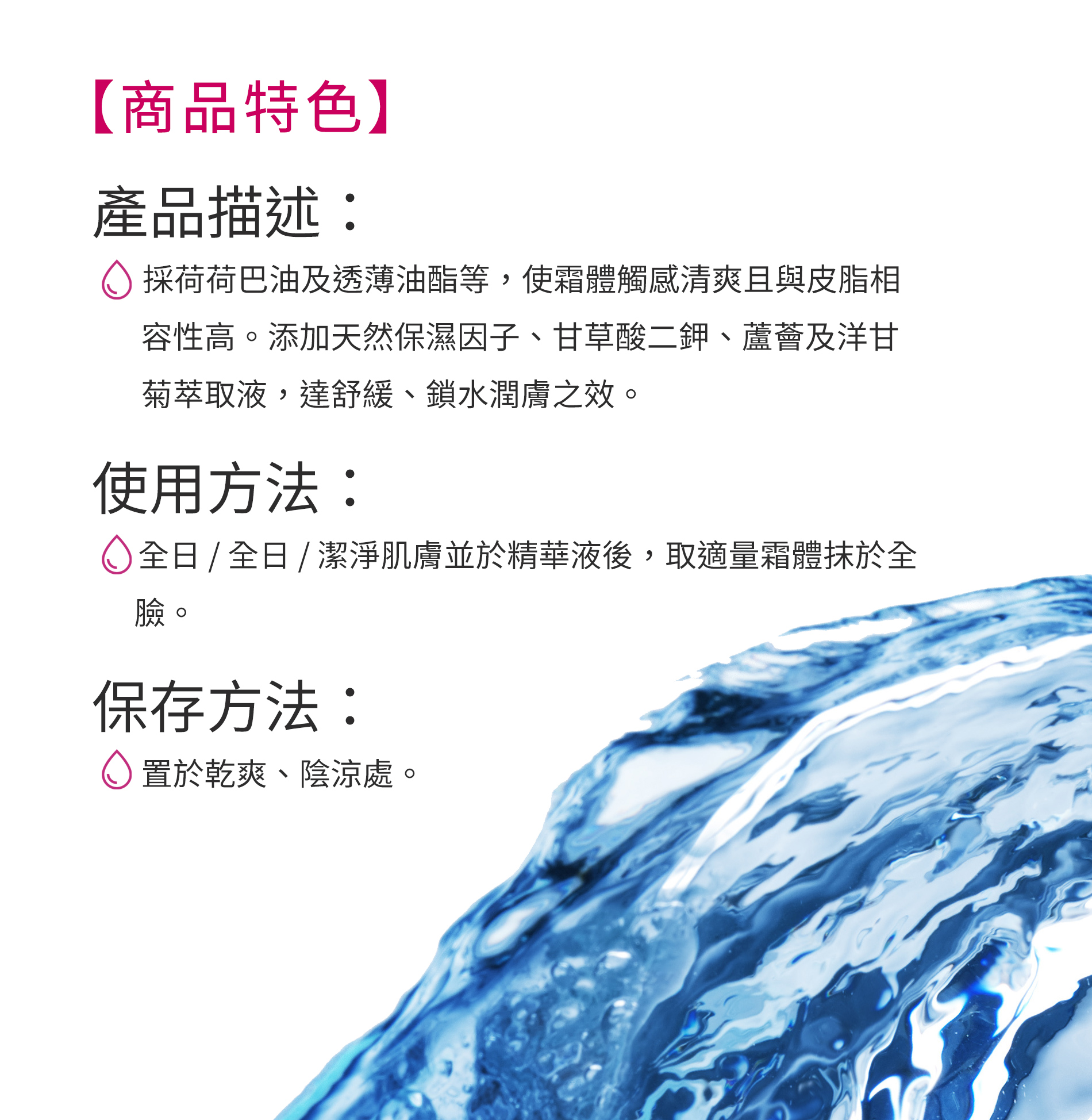 基質安全、簡單,除一般肌膚使用外,亦適合易受刺激的肌膚使用。採荷荷巴油及透薄油酯等,使霜體觸感清爽且與皮脂相 容性高。添加天然保濕因子、甘草酸二鉀、蘆薈及洋甘菊萃取液,達舒緩、鎖水潤膚之效。