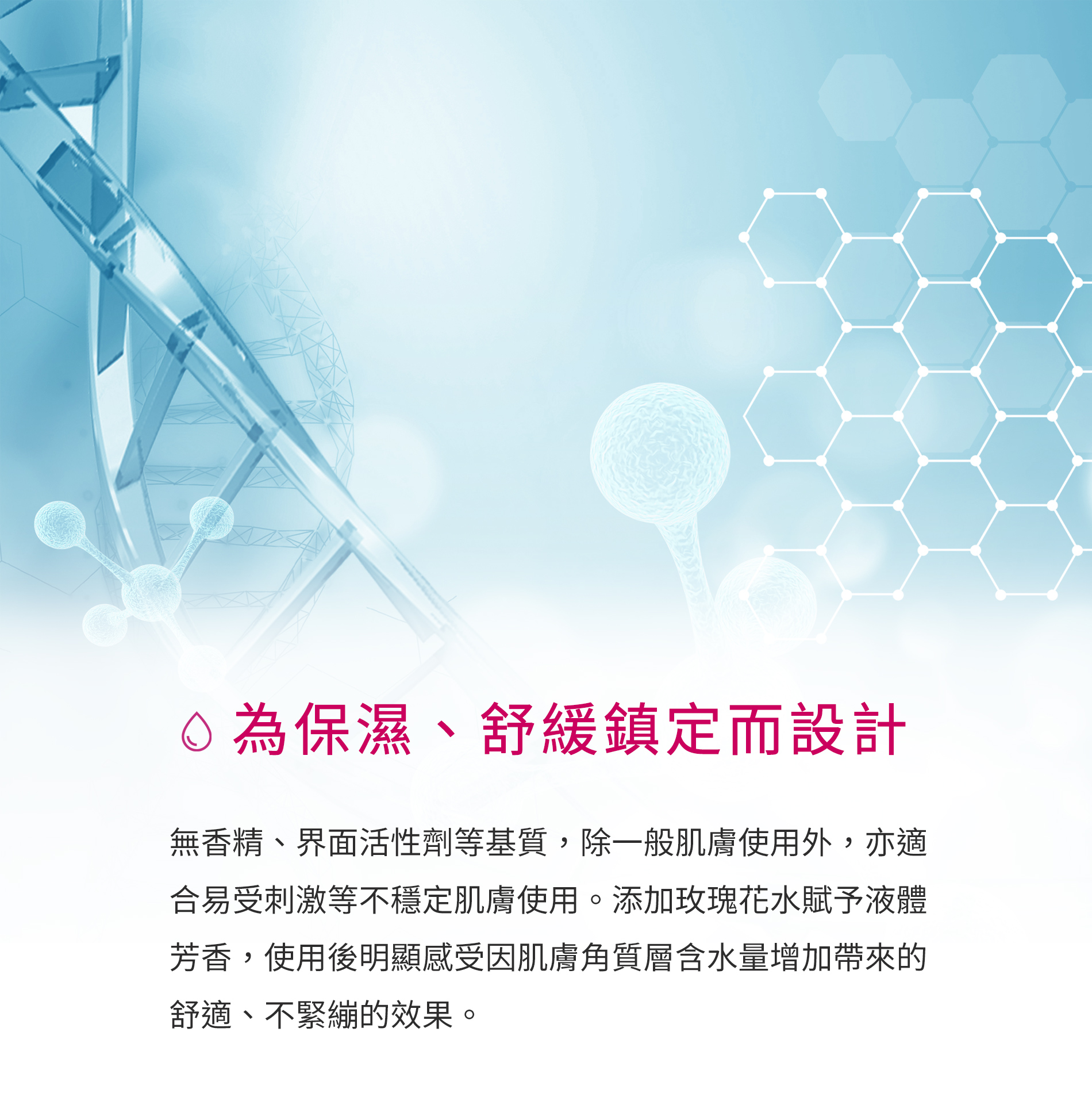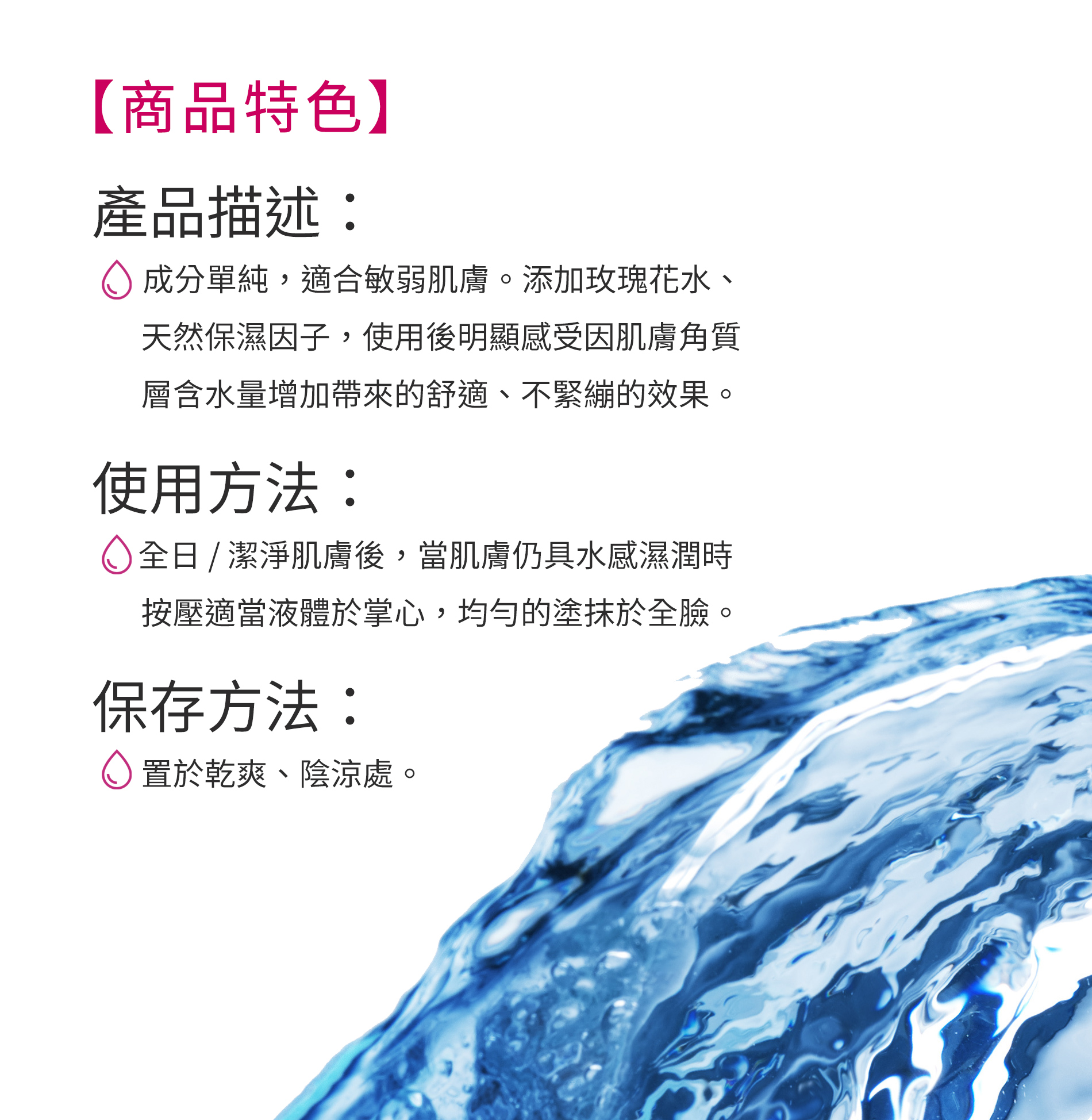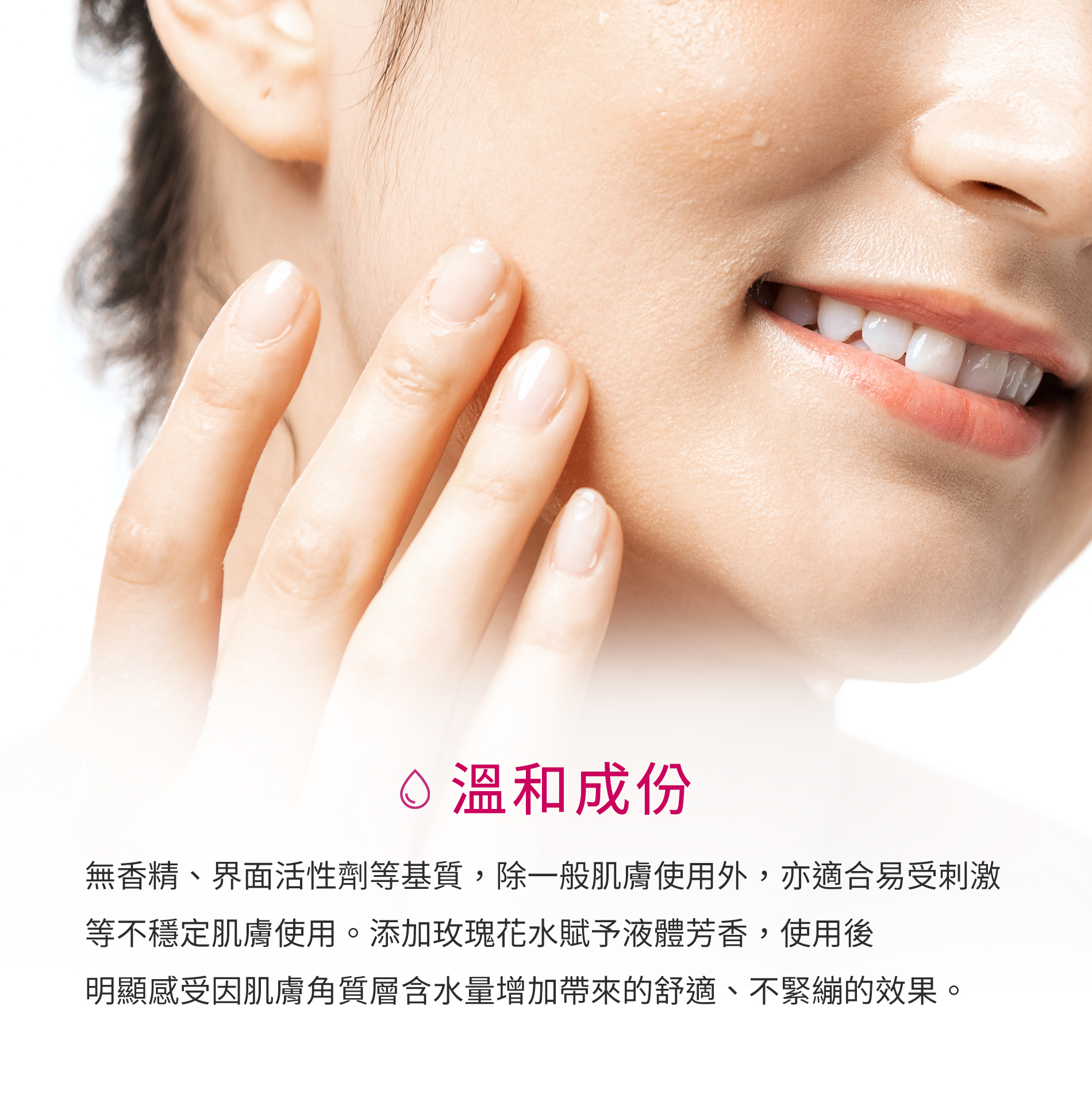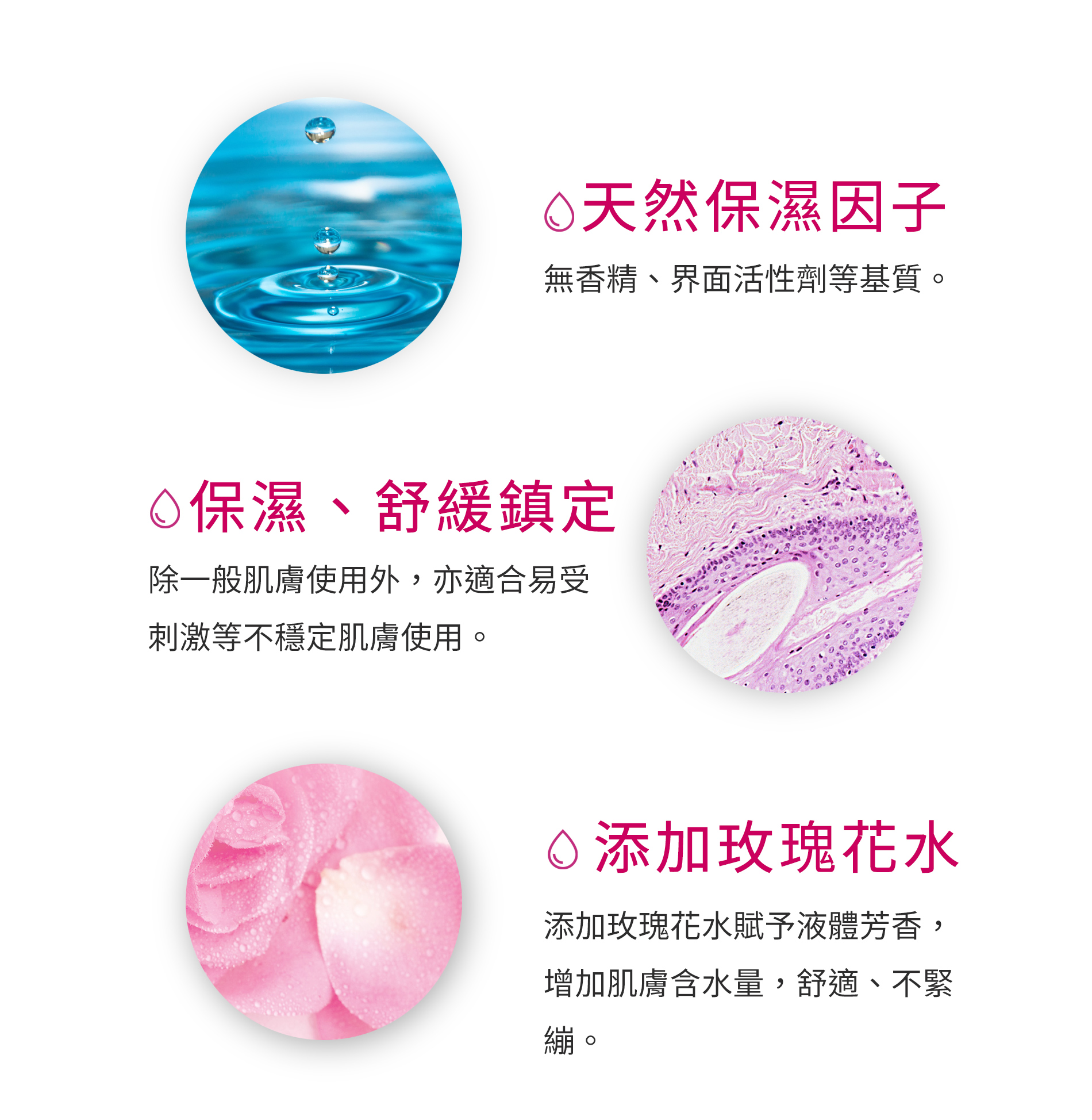 無香精、界面活性劑等基質,除一般肌膚使用外,亦適合易受刺激等不穩定肌膚使用。添加玫瑰花水賦予液體芳香,使用後