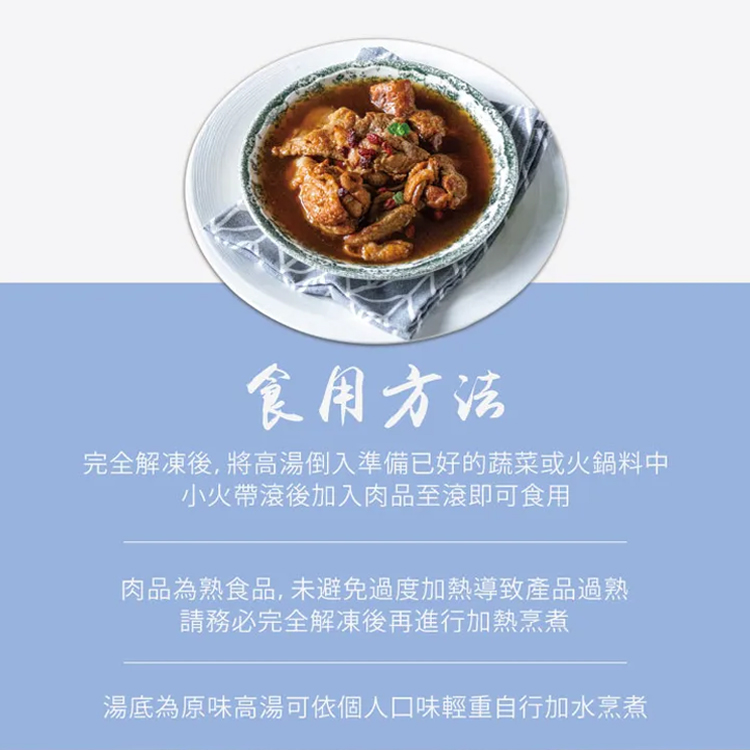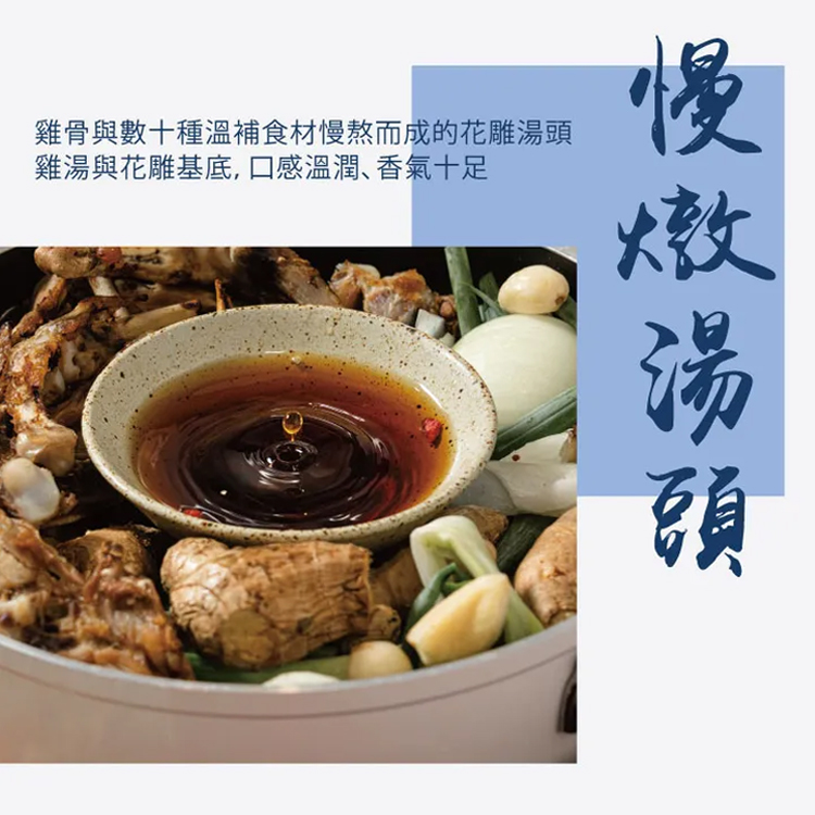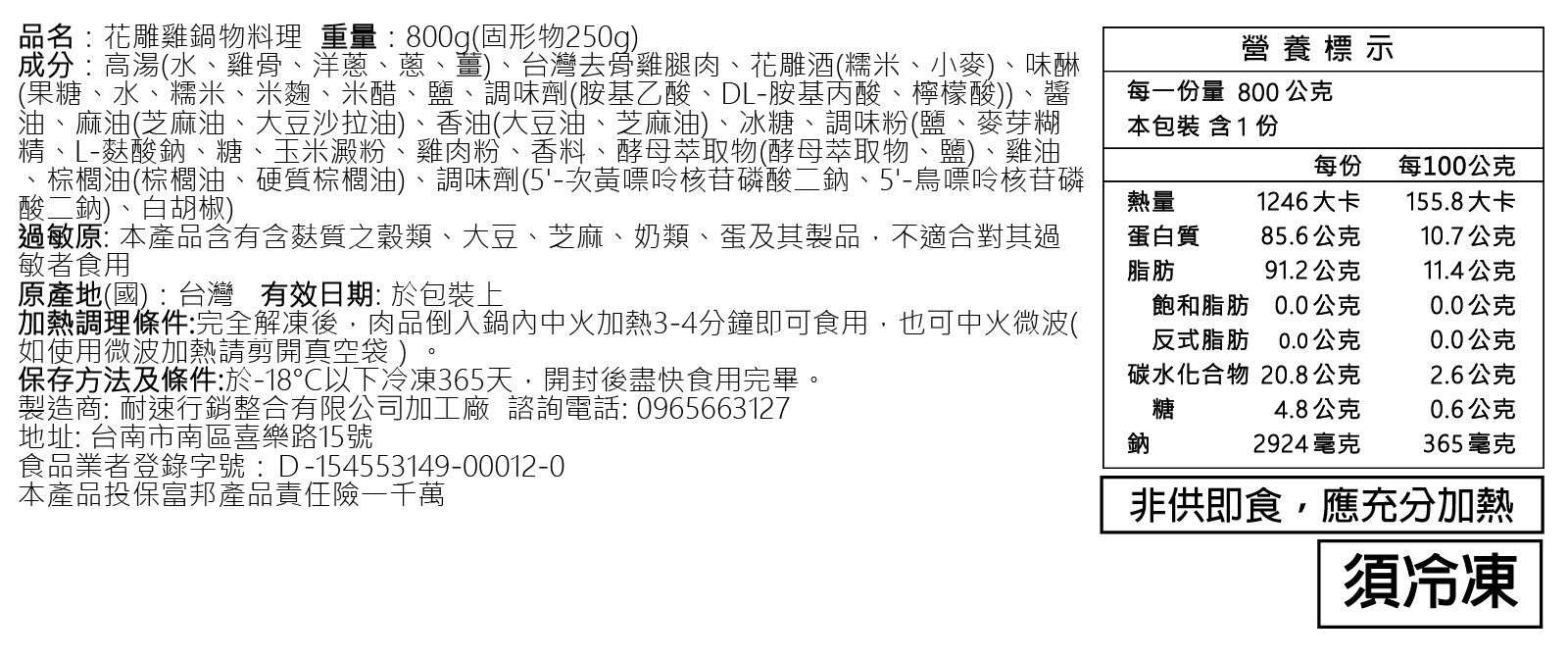 成分:高湯、台灣去骨雞腿肉、花雕酒、味醂、醬油、胡麻油、芝麻香油、冰糖