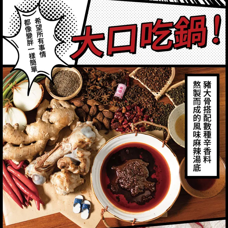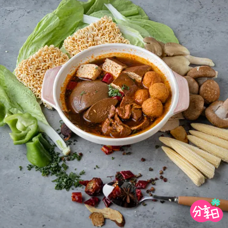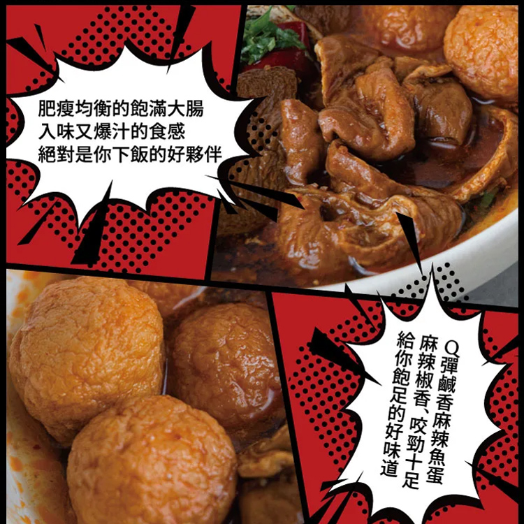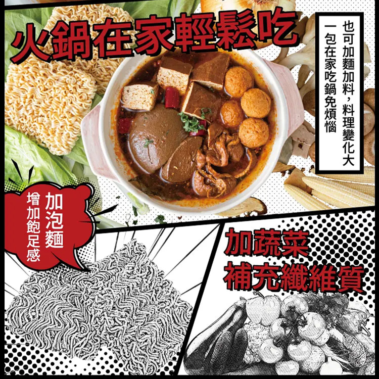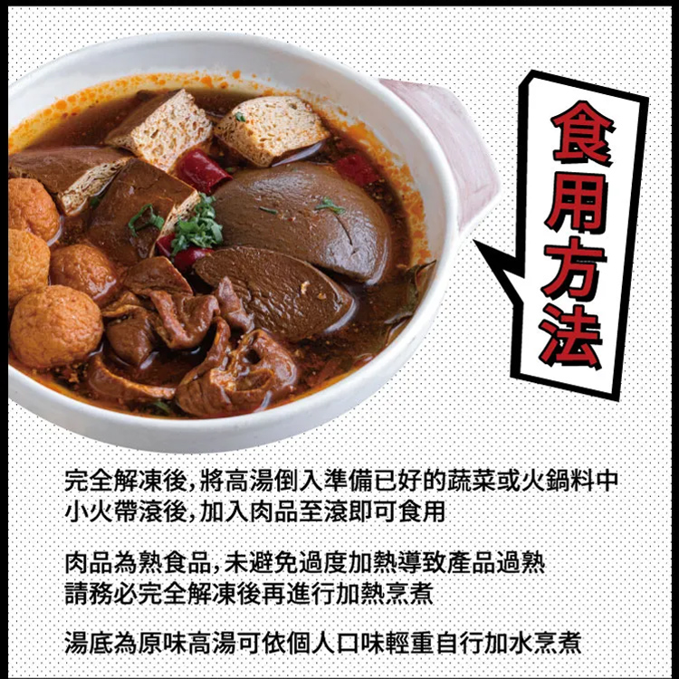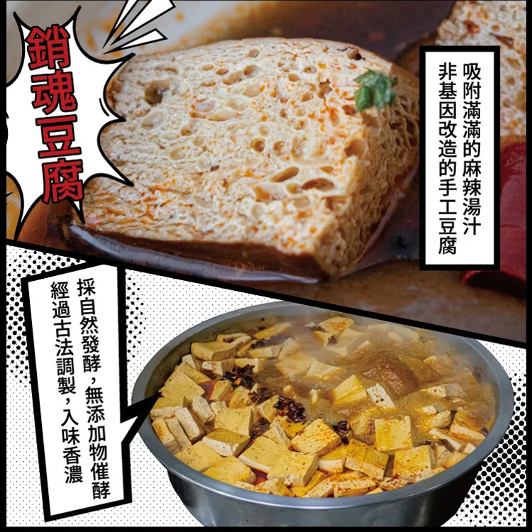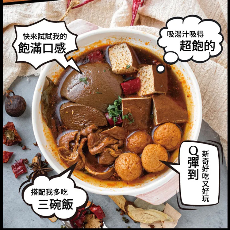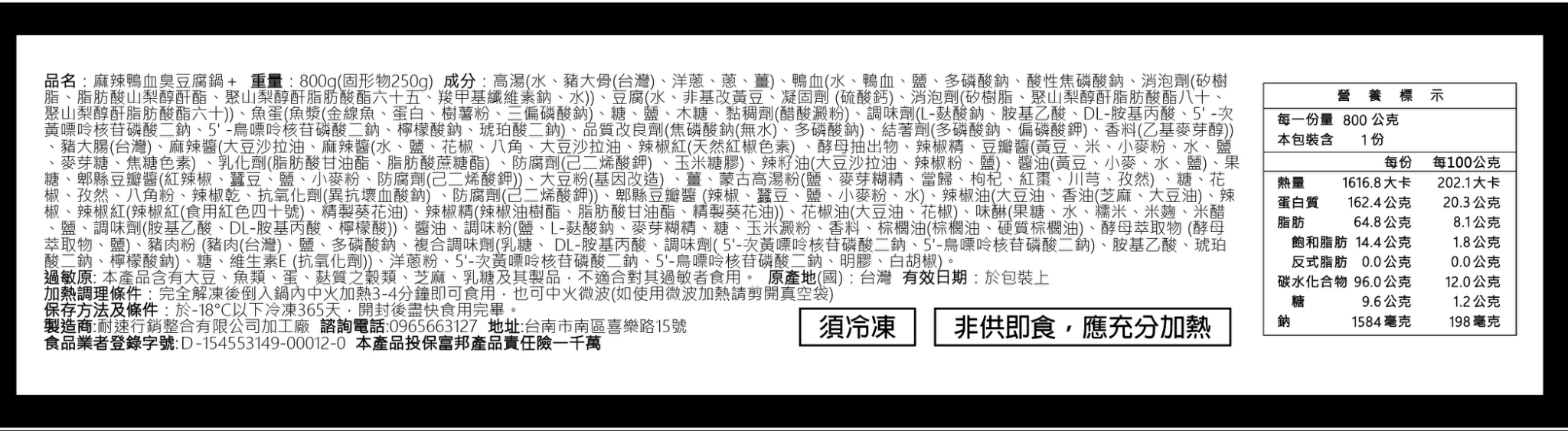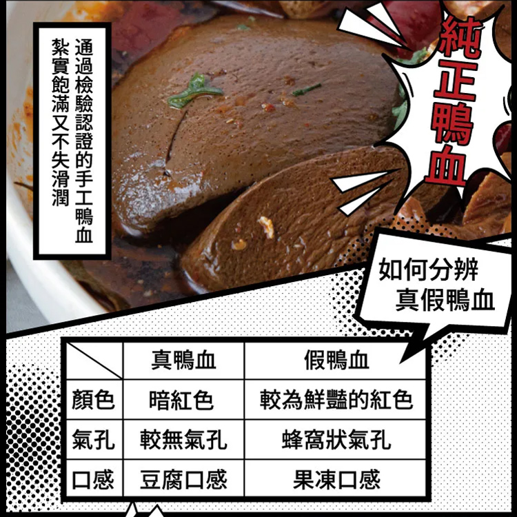 成分:大骨湯、鴨血、豆腐(非基改大豆)、魚蛋、豬腸(台灣)、麻辣醬、香油、郫縣豆瓣醬、辣椒油、花椒油、味醂、醬油、調味粉