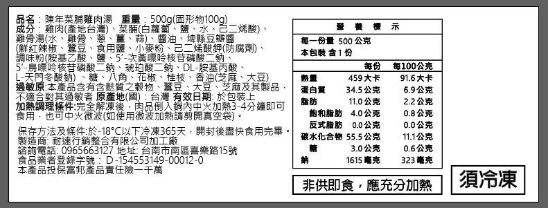 成分:雞肉(產地台灣)、菜脯、雞骨湯、醬油、埤縣豆瓣醬、糖、八角、花椒、桂枝、香油
