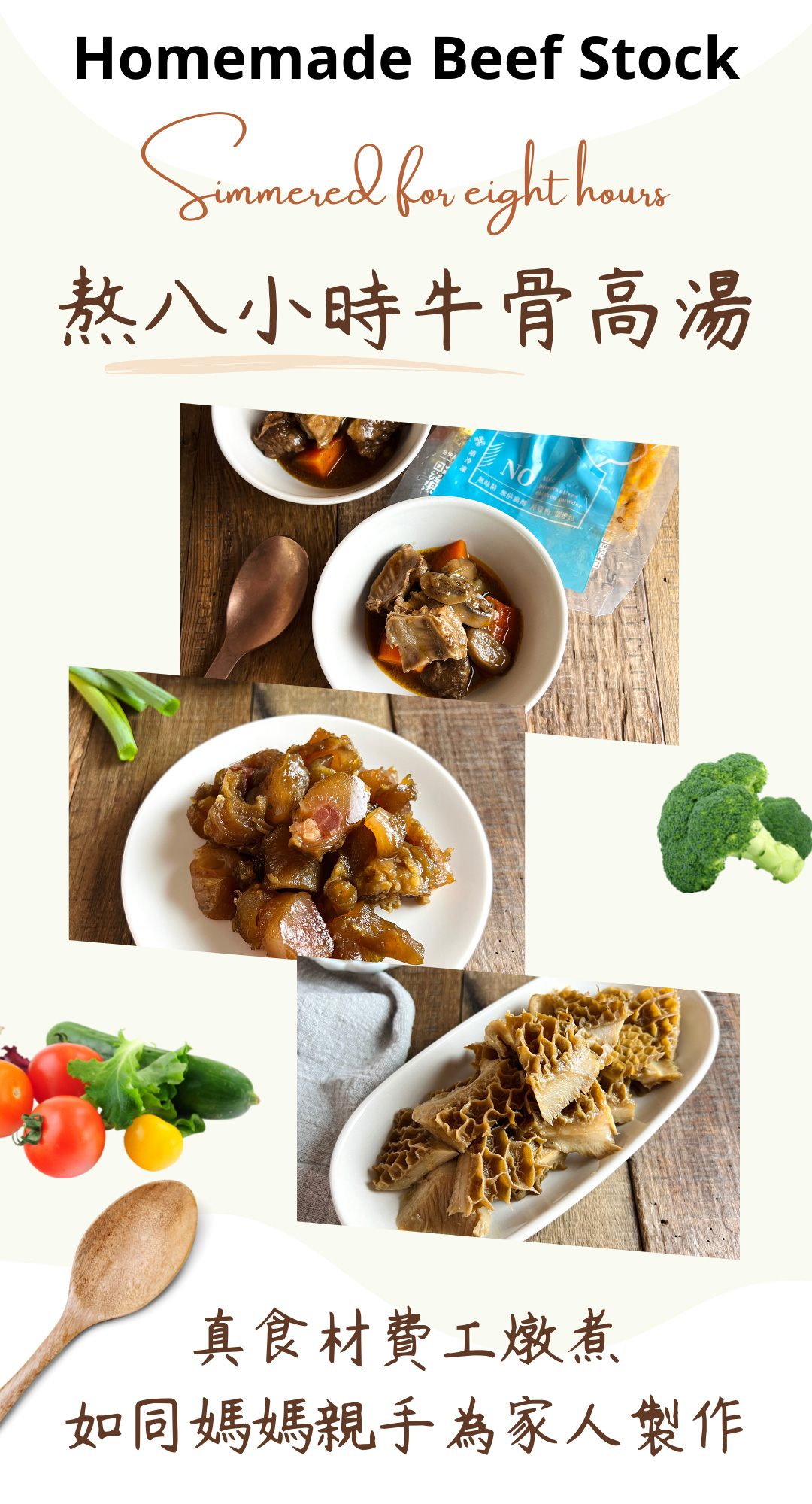 牛肋條、蕃茄糊、洋蔥、紅酒、熬煮六小時牛骨高湯、西洋芹、紅蘿蔔、月桂葉、百里香、鹽