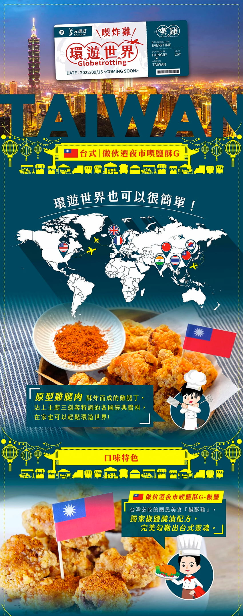 台灣必吃的國民美食『鹹酥雞』,獨家椒鹽醃漬配方,完美勾勒出台式靈魂。