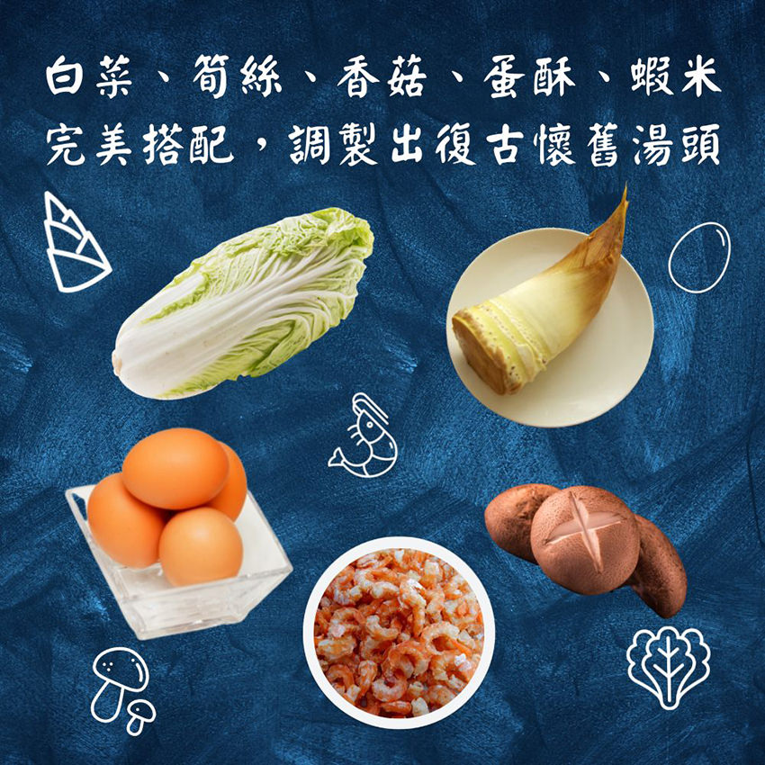 白菜、筍絲、香菇、蛋酥、蝦米完美搭配,調製出復古懷舊湯頭,