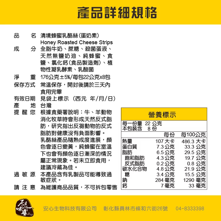 品  名|清境蜂蜜乳酪絲(蛋奶素)