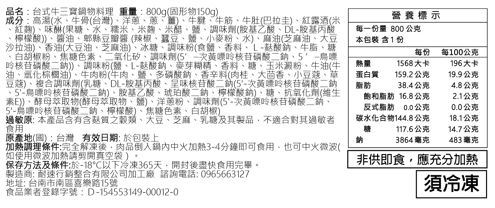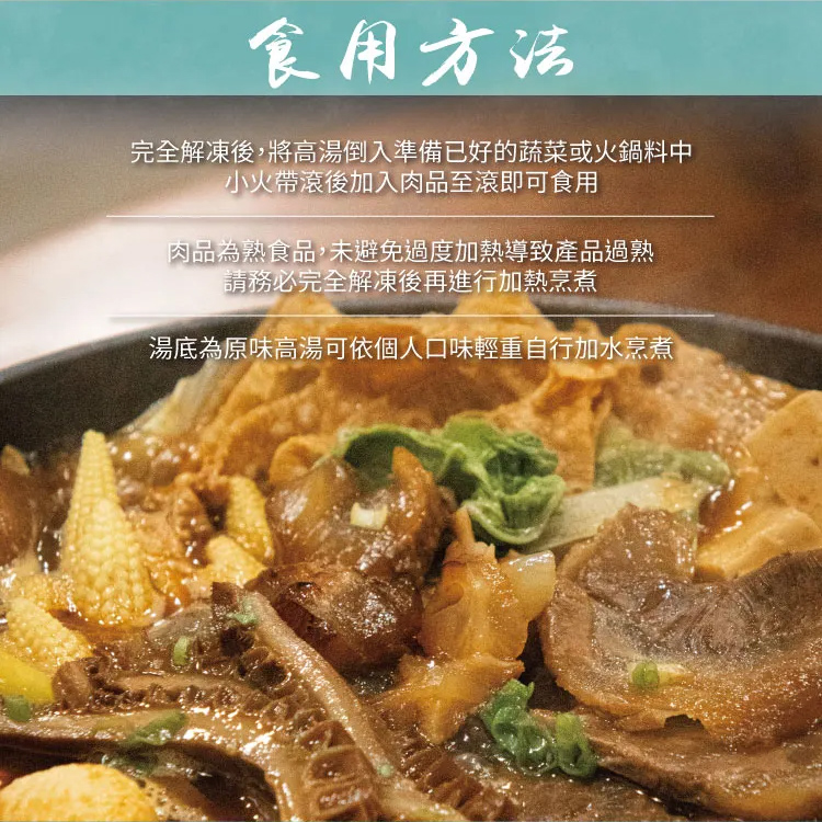 成分:高湯、牛腱、牛筋、牛肚(牛肉產地巴拉圭)、紅露酒、味醂、醬油、胡麻油、香油、冰糖