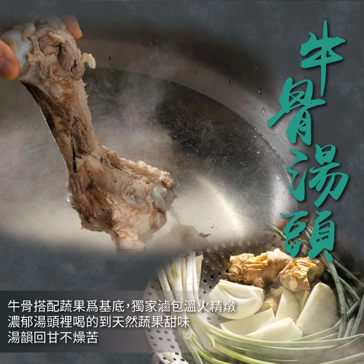 湯頭以牛骨搭配蔬果爲基底,獨家滷包溫火精燉,