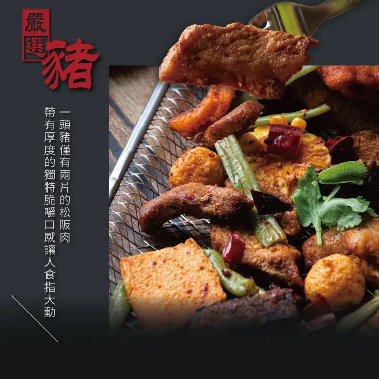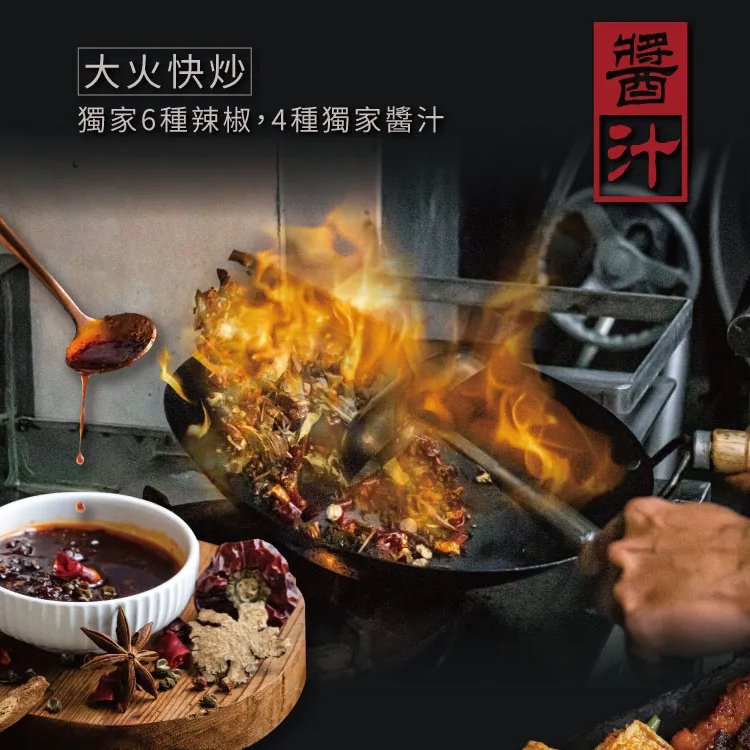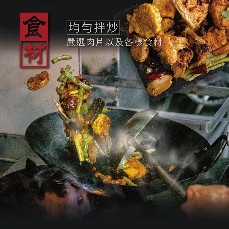 以及嚴選牛肉片、杏鮑菇、松阪豬肉片, 大火爆炒成型。
