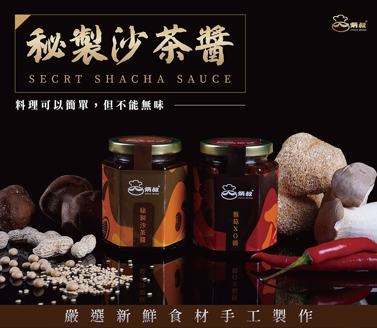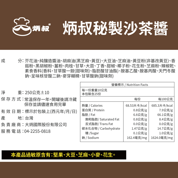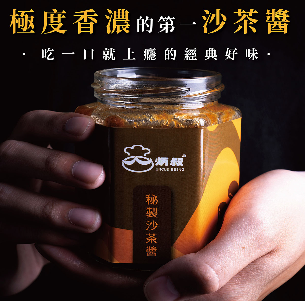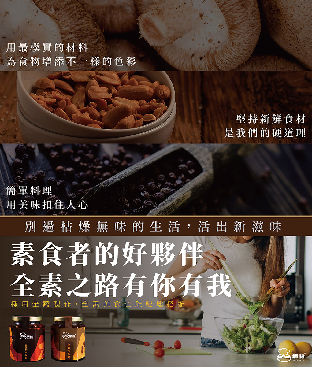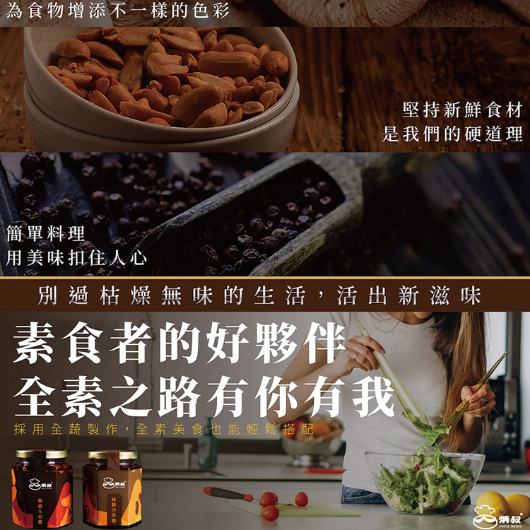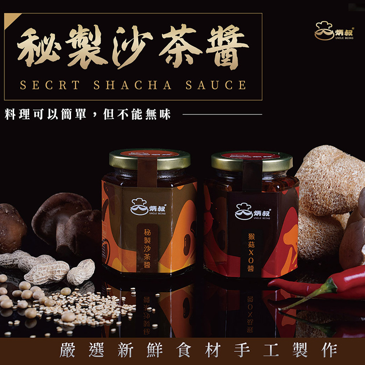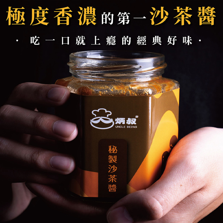 炳叔獨門沙茶醬使用頂級芥花油調製而成,嚴選數十種天然食材,濃郁的花生及香菇,使沙茶香濃而不膩,風味絕佳,無論沾、炒、滷、拌、烤皆可適用。(全素)