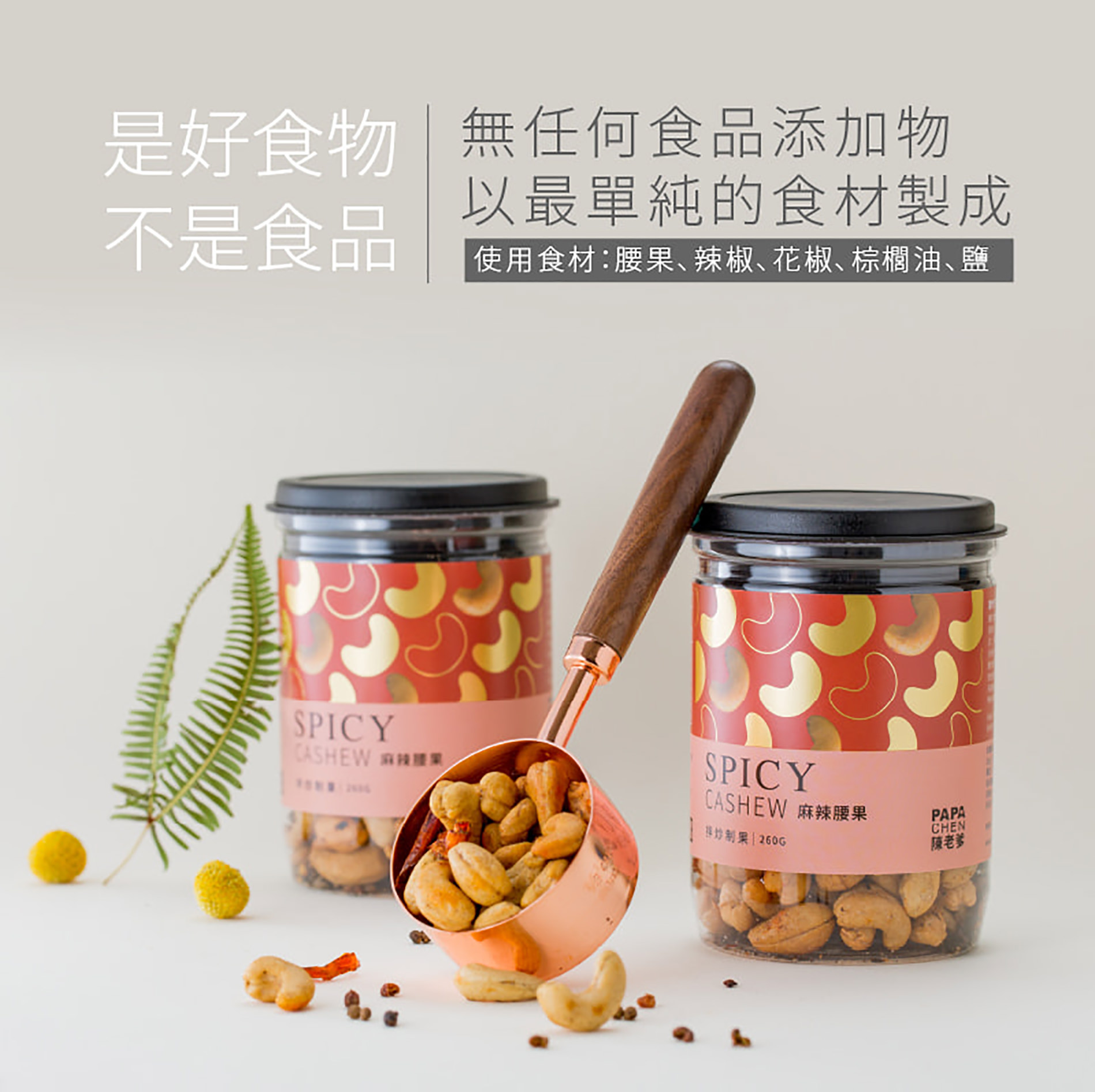 使用來自越南,通過無農藥及黃麴毒素檢驗合格的腰果仁,遵循傳統拌炒工法製作,越咀嚼越吃得到腰果的天然甜味,與市售使用烘烤製作的腰果,有著截然不同的口感。
