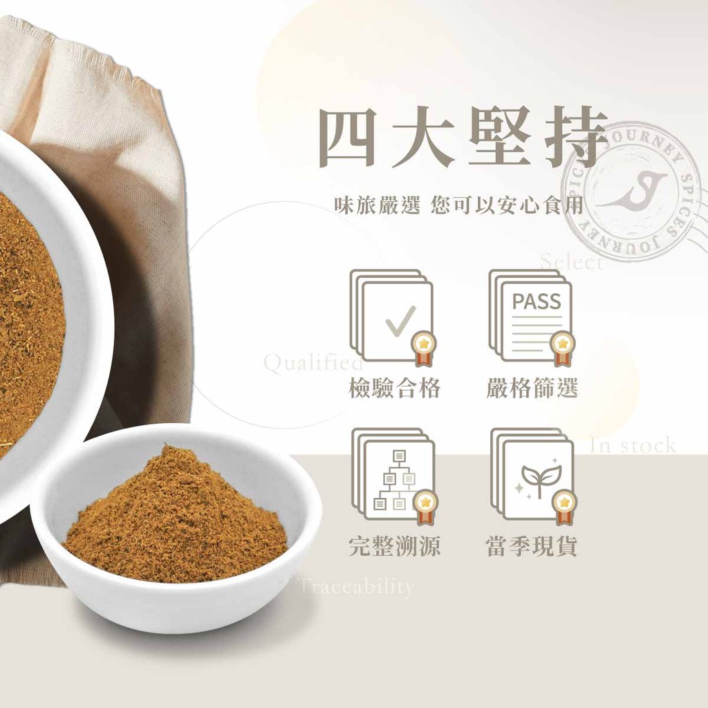 成 分:胡荽籽、孜然、白胡椒、黑胡椒、月桂葉、綠荳蔻、胡羅巴、丁香、肉荳蔻花