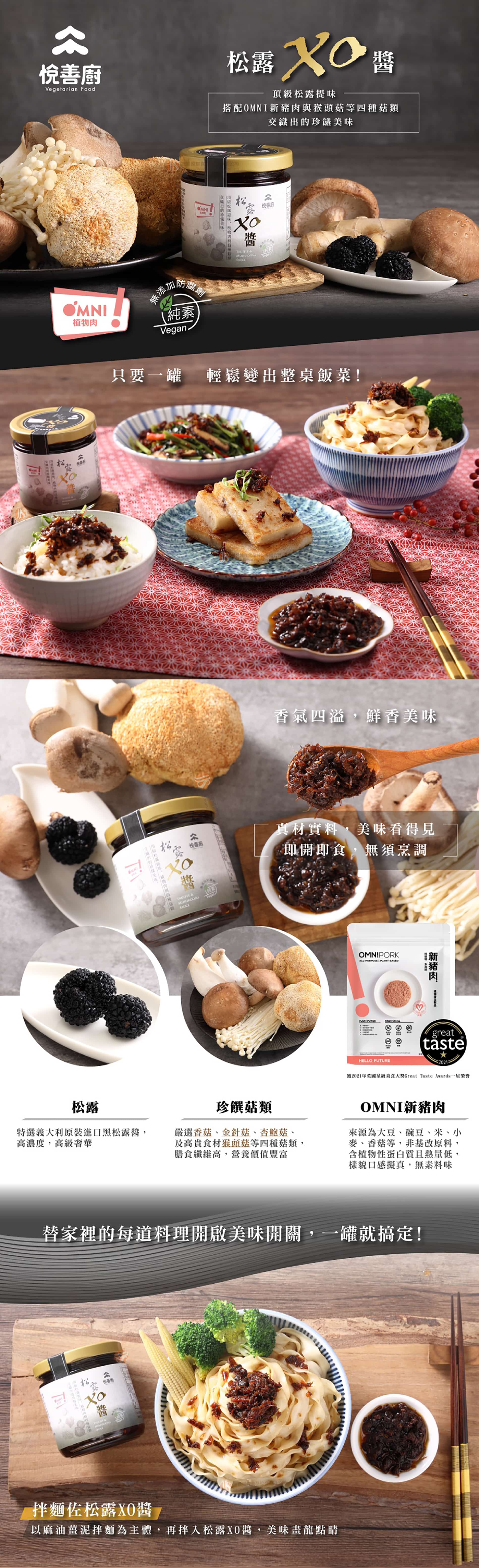 精選香菇、金針菇、杏鮑菇、及高貴食材猴頭菇等四種珍饌菇類,及OMNI新豬肉,真材實料,每湯匙挖起來都是滿滿食材,含多種植物性蛋白質及膳食纖維,口感豐富鮮香。以台東有機老薑、100%純芝麻油、純釀造黑豆蔭油…等調味,慢火熬煮,香氣四溢,鹹香美味,微辣後勁與醬香在舌尖蔓延,令人回味無窮,特選義大利原裝進口高濃度黑松露醬提味,讓每一口都值得細細品嚐。