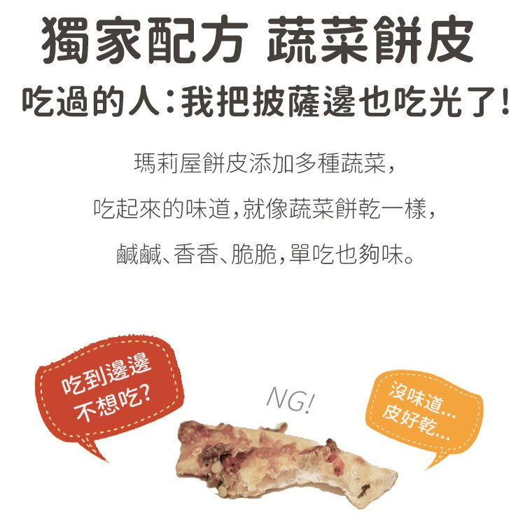 內容物:雞肉、蘑菇、起司、麵粉、洋蔥、紅椒、芹菜、迷迭香、蕃茄醬、紅蘿蔔、花椰菜、橄欖油、發酵粉、鹽、黑胡椒、義大利香料。