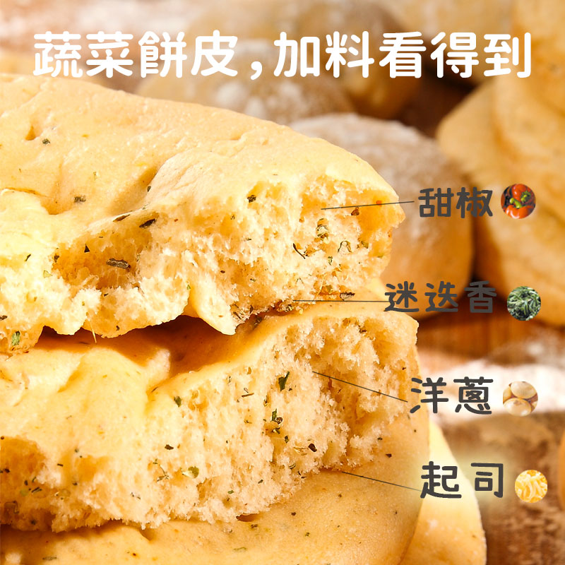 內容物:杏鮑菇、起司、麵粉、洋蔥、紅椒、芹菜、迷迭香、九層塔、紅蘿蔔、橄欖油、發酵粉、鹽、義大利香料。